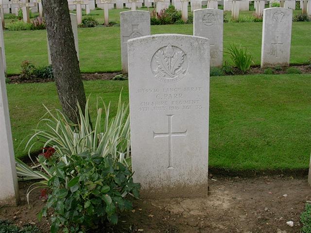 4/07/1916 Lance Serjeant Charles Parry (Parr) (Age 35) 11th Bn. Warloy-Baillon Communal Cemetery Extension, Somme France. ’11/14530′ Husband of Mrs. Parr, of 46, Pickford St., Macclesfield, Cheshire. (pic from findagrave.com – with thanks)