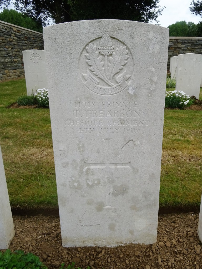 4/07/1916 Private Thomas Frearson 9th Bn. Cerisy-Gailly French National Cemetery, Somme France. ‘11718’ (pic from findagrave.com – with thanks)