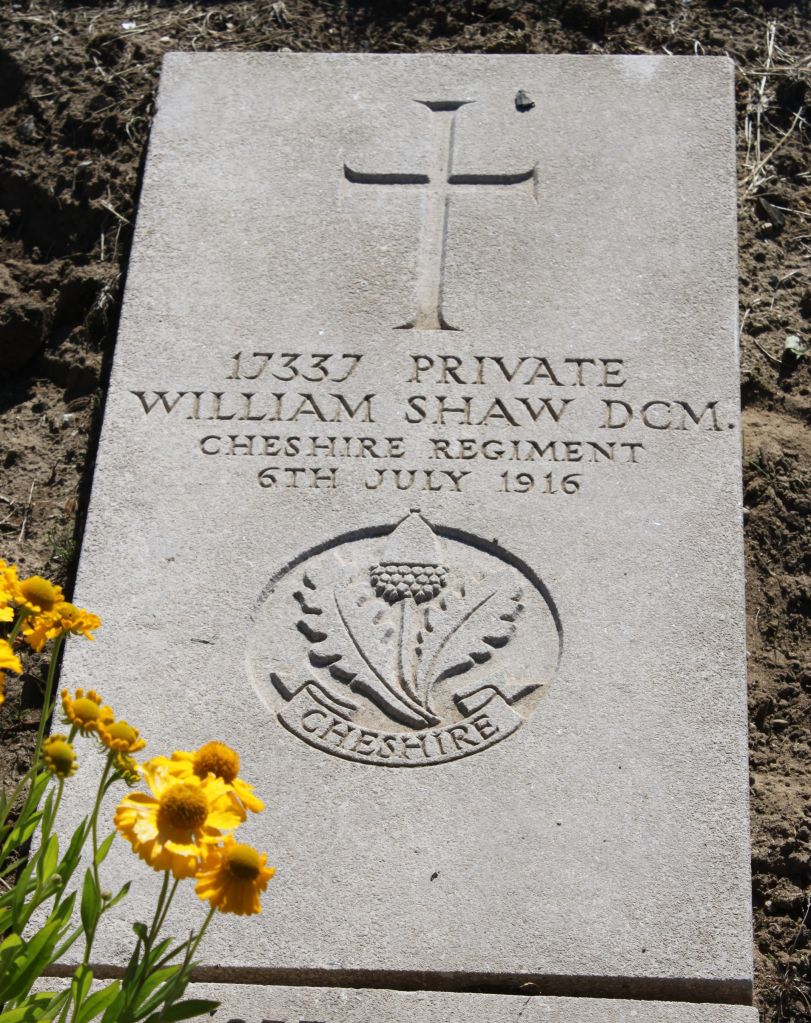 6/07/1916 Private William Shaw (Age 21) DCM 9th Bn. Boulogne Eastern Cemetery, Pas de Calais France. ‘17337’ Son of Thomas and Martha Shaw, of Tiverton, Tarporley, Cheshire. (pic from findagrave.com – with thanks)