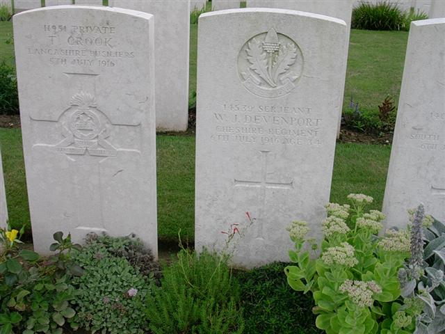 6/07/1916 Serjeant William James Devenport (Age 34) 10th Bn. Warloy-Baillon Communal Cemetery Extension, Somme France. ‘14539’ Husband of Rachel F. H. Devenport, of Rainow, Cheshire. (pic from findagrave.com – with thanks)