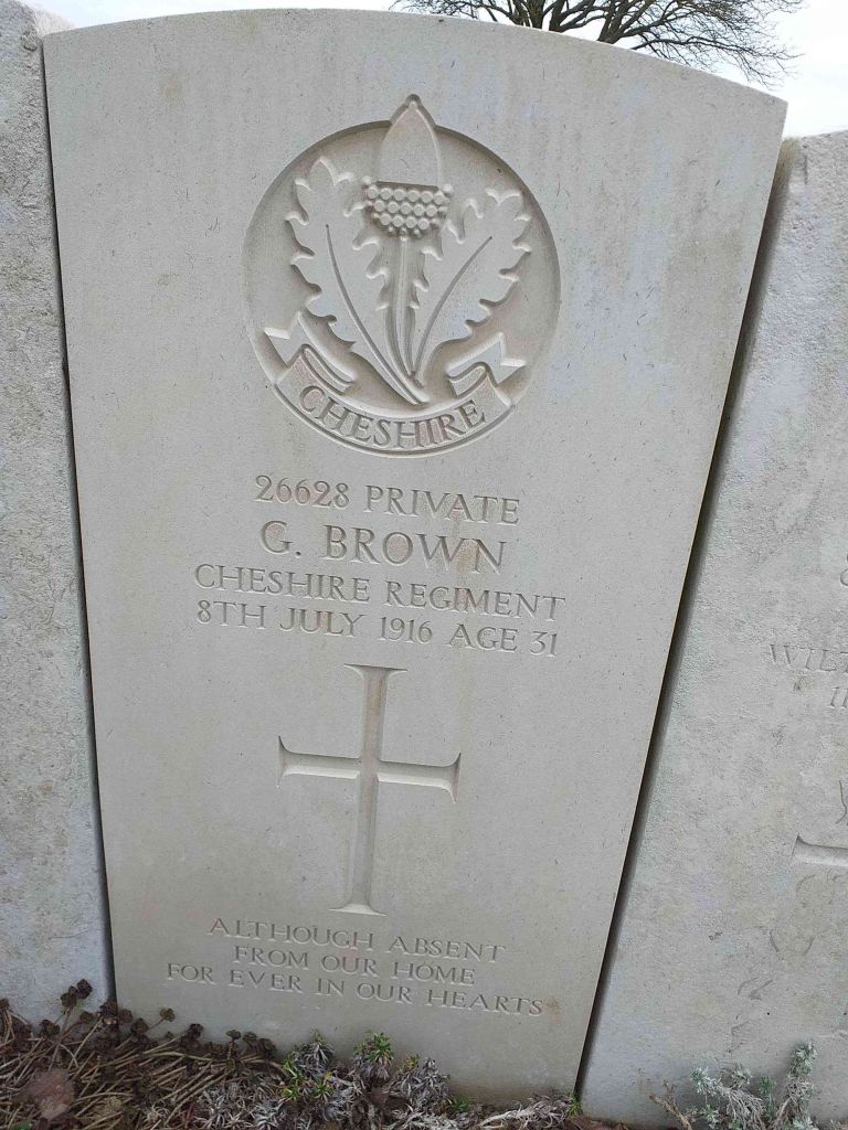 8/07/1916 Private George Brown (Age 31) 10th Bn. Puchevillers British Cemetery, Somme France. ‘26628’ Son of George and Jane Brown, of 3, Hampson St., Sale Moor, Cheshire. (pic from findagrave.com – with thanks)