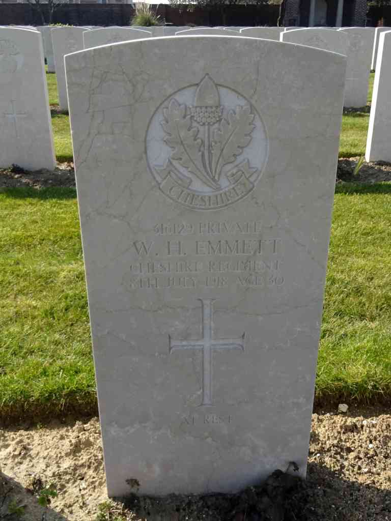8/07/1918 Private William Henry Emmett (Age 30) 1st Bn. Les Baraques Military Cemetery, Sangatte, Pas de Calais France. ‘316129’ Husband of Mrs. Emmett, of 17, Durham St., Harpurhey, Manchester. (pic from findagrave.com – with thanks)