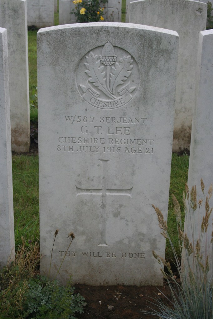 8/07/1916 Serjeant George Thomas Lee (Age 21) 1st Coy. 13th Bn. Warloy-Baillon Communal Cemetery Extension, Somme France. ‘W/587’ Son of Thomas and Elizabeth Ann Lee, of Wallasey. (pic from findagrave.com – with thanks)