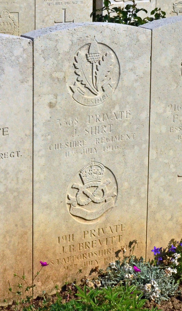 11/07/1916 Private James Shirt (Age 19) A Coy. 6th Bn. Le Treport Military Cemetery, Seine-Maritime France. ‘3368’ Son of Benjamin and Annie Shirt, of Glossop. (pic from findagrave.com – with thanks)