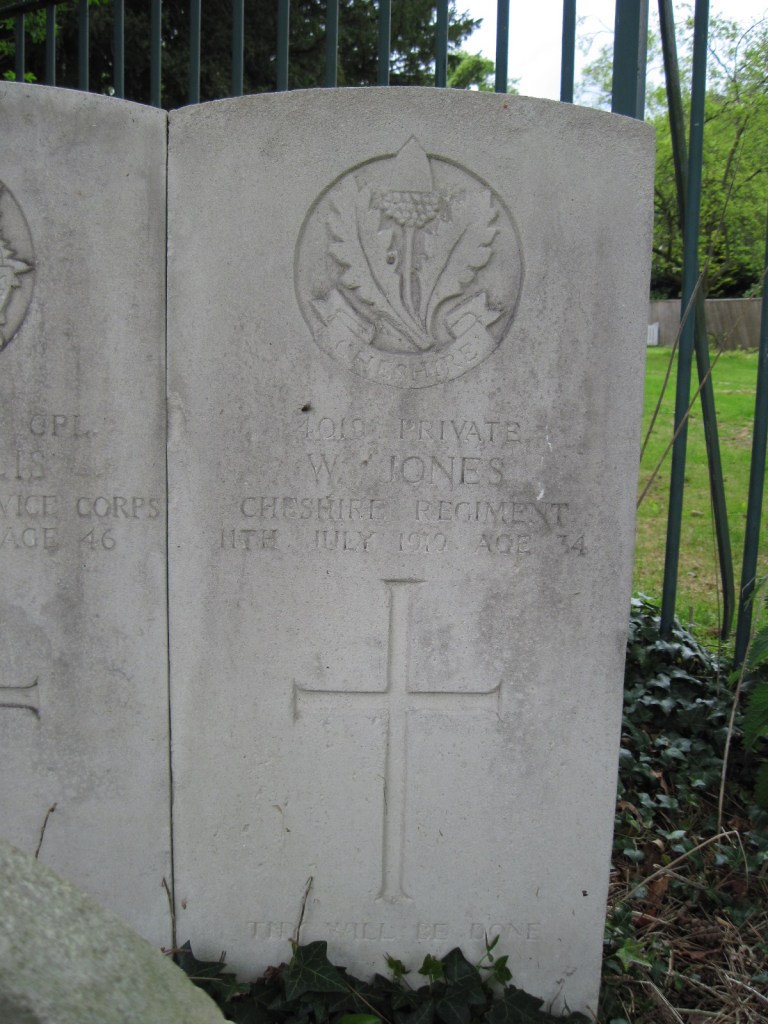 11/07/1919 Private William Jones (Age 34) 3rd/5th Bn. 5389 Transferred to (78584) The King’s Liverpool Regt., then to (53639) Labour Corps. Chester (Overleigh) Cemetery, Cheshire United Kingdom. Husband of Edith Jones, of 39, Back Brook St., Chester. (pic from findagrave.com – with thanks)