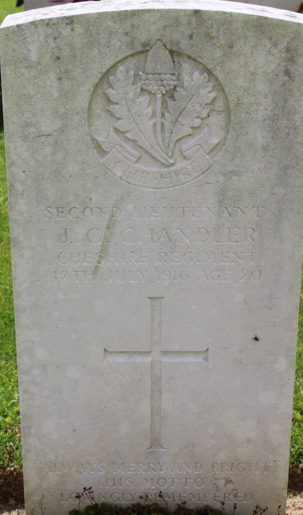 12/07/1916 Second Lieutenant James Cooke Chandler (Age 20) 17th Bn. attd. 11th Bn. Bouzincourt Communal Cemetery Extension, Somme France. Son of Mr. J. W. and Mrs. S. B. Chandler, of 22, Holly Bank Rd., Birkenhead. (pic from findagrave.com – with thanks)