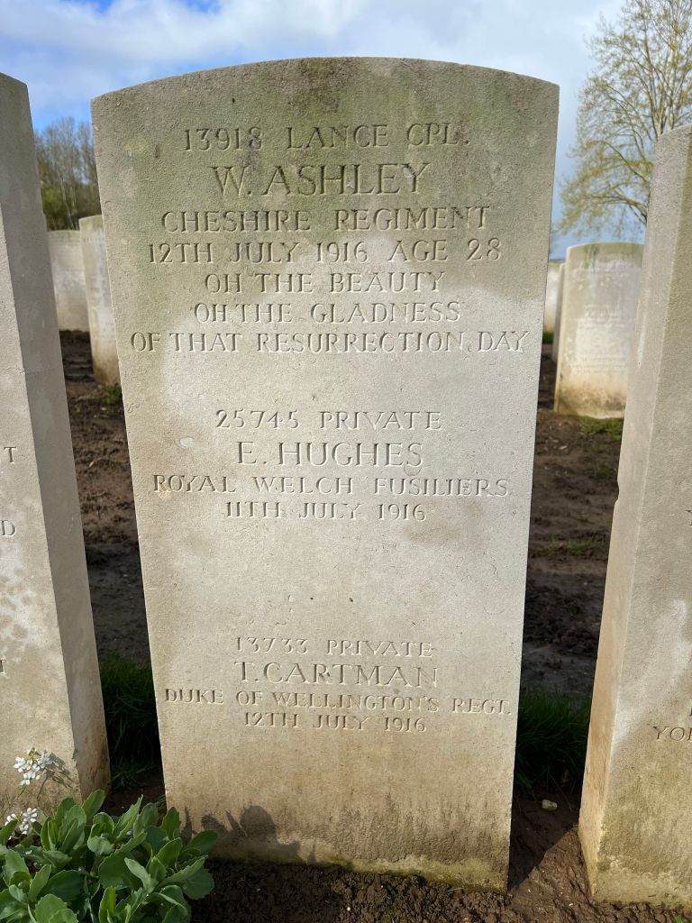 12/07/1916 Lance Corporal William Ashley (Age 28) 10th Bn. Heilly Station Cemetery, Mericourt-L’abbe, Somme France. ‘13918’ Son of Joseph and Agnes Ashley, of Barnton, Cheshire; husband of Annie Tomlinson (formerly Ashley), of 9, Forest St., Weaverham, Cheshire. (pic from findagrave.com – with thanks)