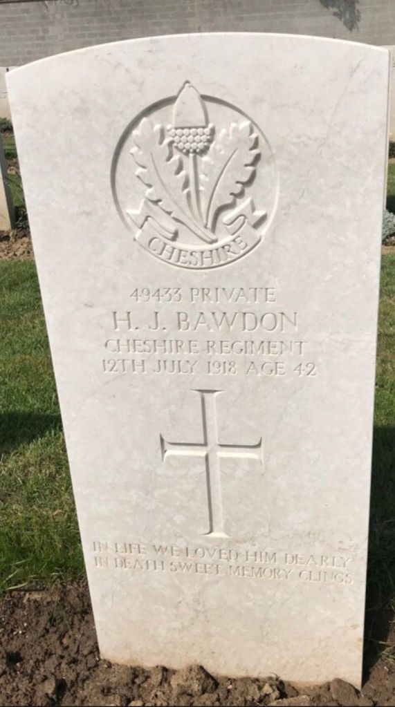 12/07/1918 Private Henry James Bawdon (Age 42) 10th Bn. Terlincthun British Cemetery, Wimille, Pas de Calais France. ‘49433’ Son of Oliver and Elizabeth Bawdon, of 26, Rake Lane, Bromborough, Birkenhead. (pic from findagrave.com – with thanks)