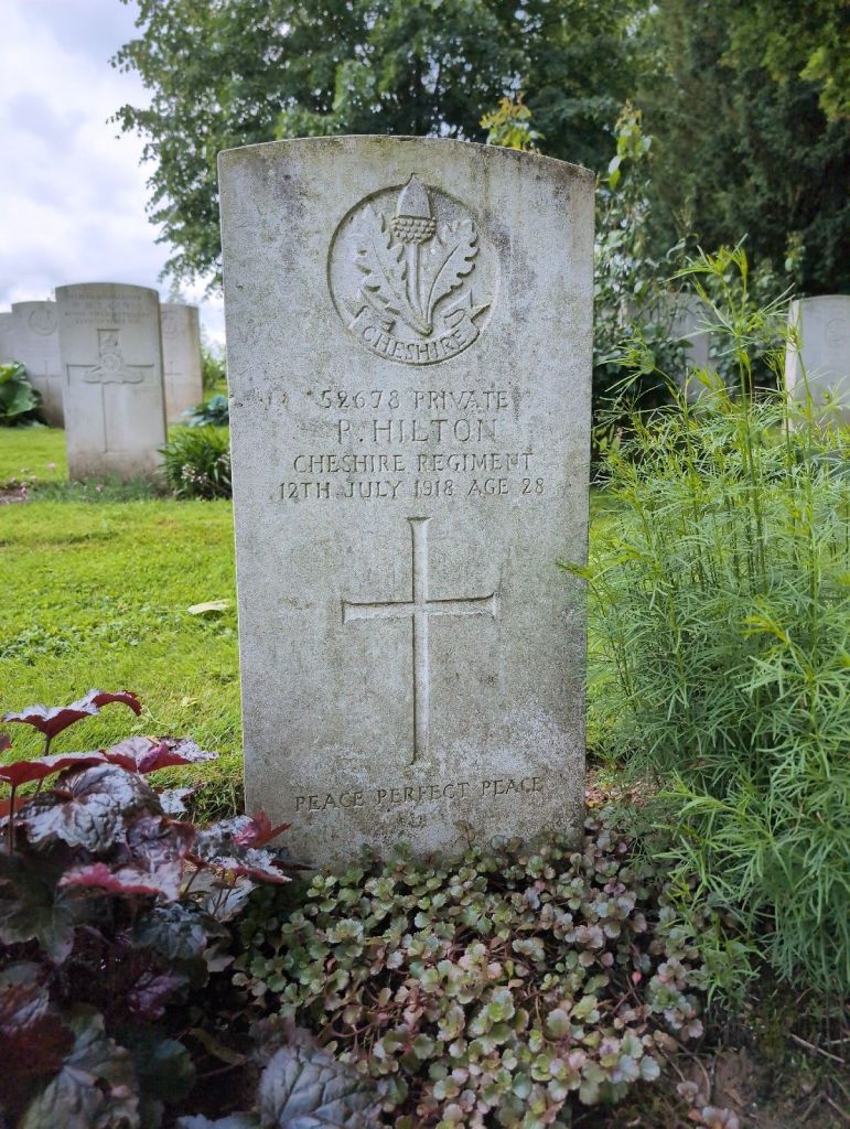12/07/1918 Private Percy Hilton (Age 28) 11th Bn. Niederzwehren Cemetery, Kassel, Hessen Germany. ‘52678’ Son of Samuel and Eliza Hilton, of Dukinfield; husband of Mrs. E. Hilton, of 260, Higher King St., Dukinfield, Cheshire. (pic from findagrave.com – with thanks)