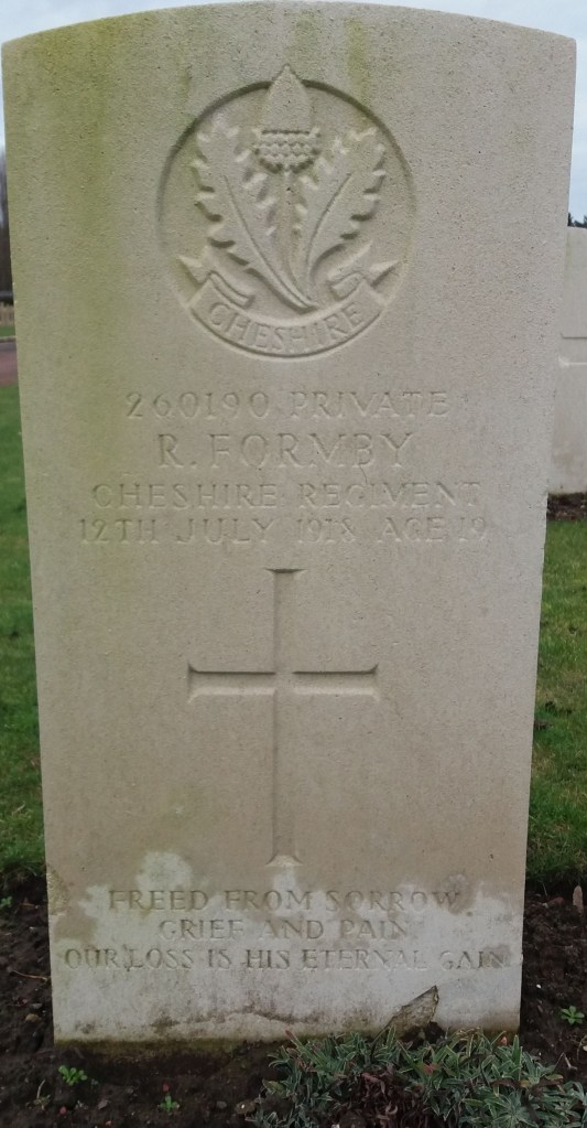 12/07/1918 Private Robert Formby (Age 19) 15th Bn. Valenciennes (St. Roch) Communal Cemetery, Nord France. ‘260190’ Son of James and Charlotte Formby, of 22, Havelock St., St. Helens, Lancs. (pic from findagrave.com – with thanks)