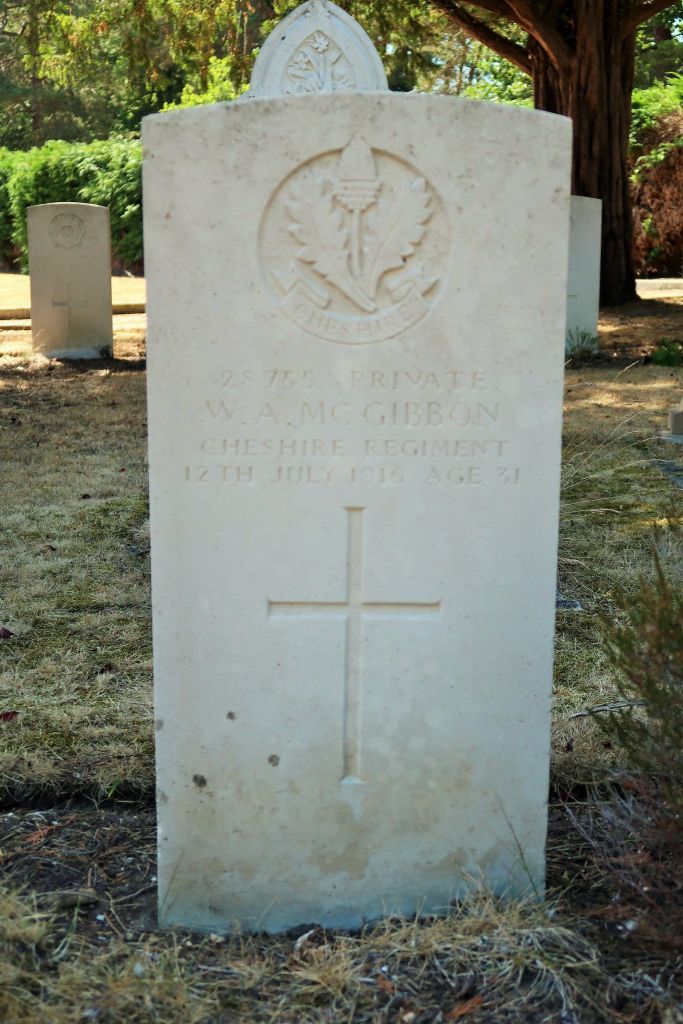 12/07/1916 Private William Arthur McGibbon (Age 31) 9th Bn. Bordon Military Cemetery, Hampshire United Kingdom. ‘28755’ Husband of Laura McGibbon, of 3, Lower Harding St., Northampton. (pic from findagrave.com – with thanks)