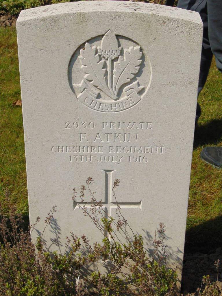 13/07/1916 Private Fred Atkin 1st/6th Bn. Gorre British and Indian Cemetery, Pas de Calais France. ‘2930’ Son of Mr. A. E. Atkin, of 102, Newbridge Lane, Stockport, Cheshire. (pic from findagrave.com – with thanks)