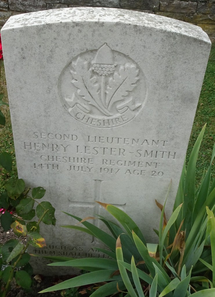 14/07/1917 Second Lieutenant Henry Lester-Smith (Age 20) 4th Bn. Oosttaverne Wood Cemetery, West-Vlaanderen Belgium. Son of Jane Lester-Smith, of 29, Lorne St., Chester, and the late Henry Lester-Smith. Born at Halkyn, Flints.