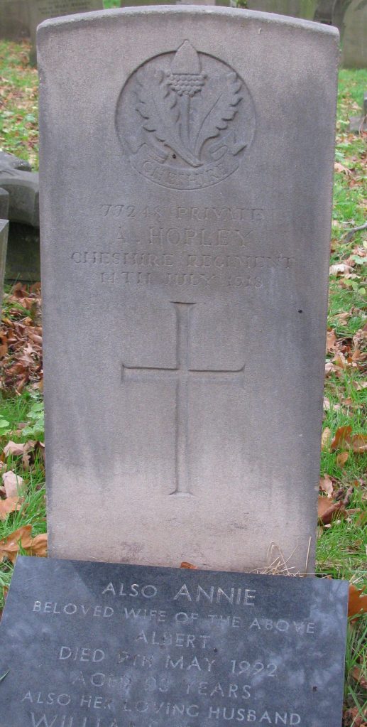 14/07/1918 Private Albert Hopley 3rd Bn. Frodsham (St. Laurence) Churchyard, Cheshire United Kingdom. ‘77248’ (pic from findagrave.com – with thanks)