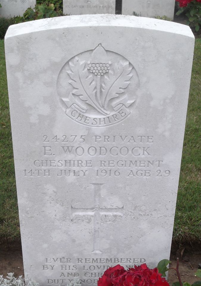 14/07/1916 Private Ernest Woodcock (Age 29) 10th Bn. Pozieres British Cemetery, Ovillers-La Boisselle, Somme France. ‘24275’ Son of John and Mary Woodcock, of Great Barrow; husband of Hannah Elizabeth Woodcock, of Oaklands, Little Barrow, Chester. (pic from findagrave.com – with thanks)