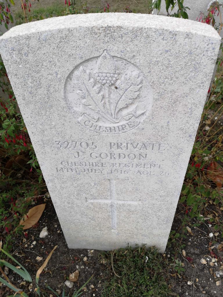 14/07/1916 Private John Gordon (Age 26) 11th Bn. St. Sever Cemetery, Rouen, Seine-Maritime France. ‘32705’ Son of John and Emily Gordon, of Onchan, Isle of Man. (pic from findagrave.com – with thanks)