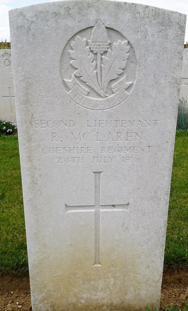 17/07/1916 Second Lieutenant Royal Mclaren (Age 35) 16th Bn. Dive Copse British Cemetery, Sailly-Le-Sec, Somme France. Son of Mr. and Mrs. Charles McLaren, of “Dormi,” Blundellsands, Liverpool; husband of Lisa McLaren, of “Ilsenburg,” Ainsdale, Southport. (pic from findagrave.com – with thanks)