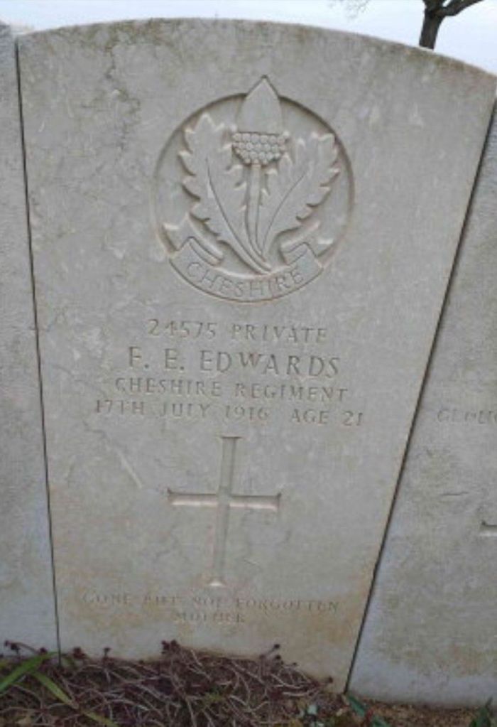 17/07/1916 Private Fred Edge Edwards (Age 23) 10th Bn. Puchevillers British Cemetery, Somme France. ‘21575’ Son of John and Jane Edwards, of Long Lane, Over Peover, Cheshire. (pic from findagrave.com – with thanks)