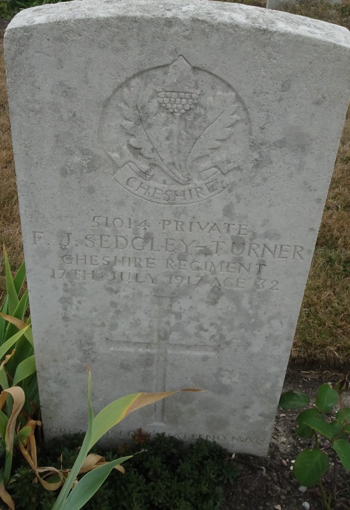 17/07/1917 Private Frederic James Sedgley-Turner (Age 32) 9th Bn. Oosttaverne Wood Cemetery, West-Vlaanderen Belgium. ‘51014’ (Served as TURNER). Son of Reuben Sedgley-Turner, husband of Charlotte A. Sedgley-Turner, of 6, Camberwell Terrace, Leamington Spa, Warwickshire.