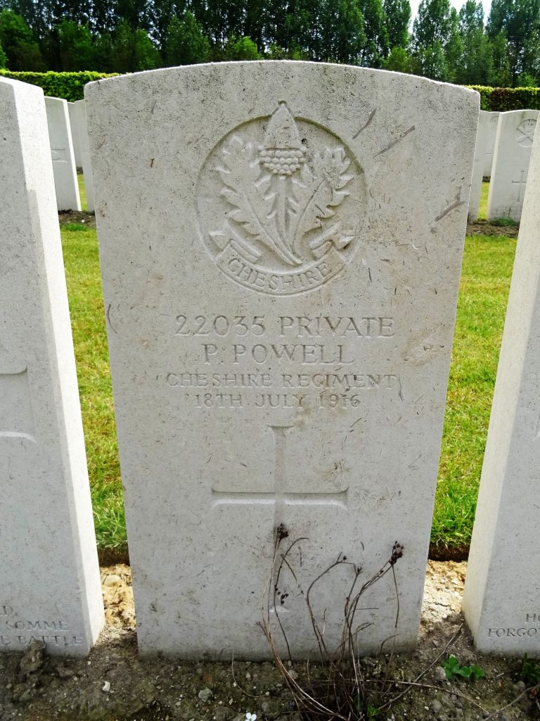 18/07/1916 Private Patrick Powell 16th Bn. La Neuville British Cemetery, Corbie, Somme France. ‘22035’ Husband of Mrs. E. Powell, of 106, Portland St., Everton, Liverpool. (pic from findagrave.com – with thanks)