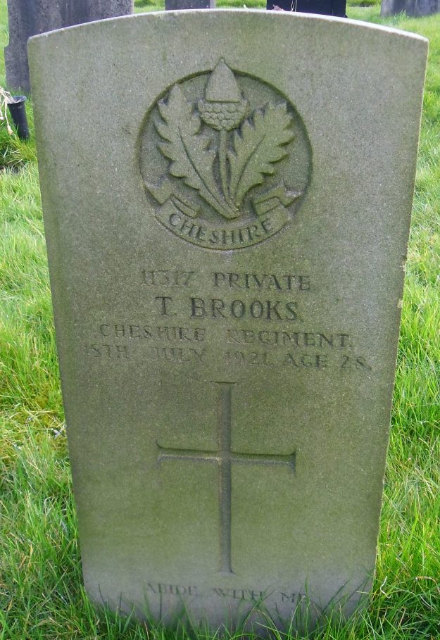 18/07/1921 Private Thomas Brooks (Age 28) “C” Coy. 8th Bn. Stockport Borough Cemetery, Cheshire United Kingdom. ‘11317’ Son of George and Louisa Brooks, of 67, Bann St., Stockport. (pic from findagrave.com – with thanks)