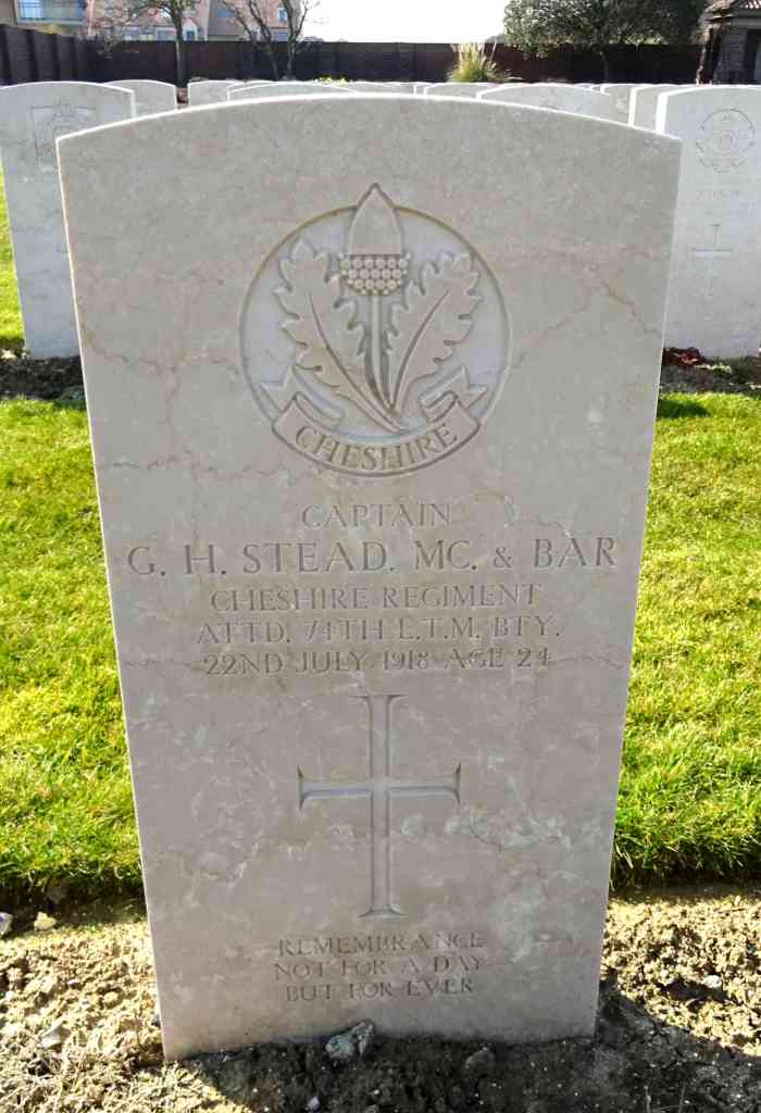 22/07/1918 Captain Geoffrey Henry Stead (Age 24) MC and Bar Les Baraques Military Cemetery, Sangatte, Pas de Calais France. Son of William and Edith Louisa Stead, of “Ermelo,” Seddon Rd., Hale, Cheshire. Of Manchester. Previously severely wounded. He was Captain of the 74th L.T.M. Bty. from early in 1916. (pic from findagrave.com – with thanks)