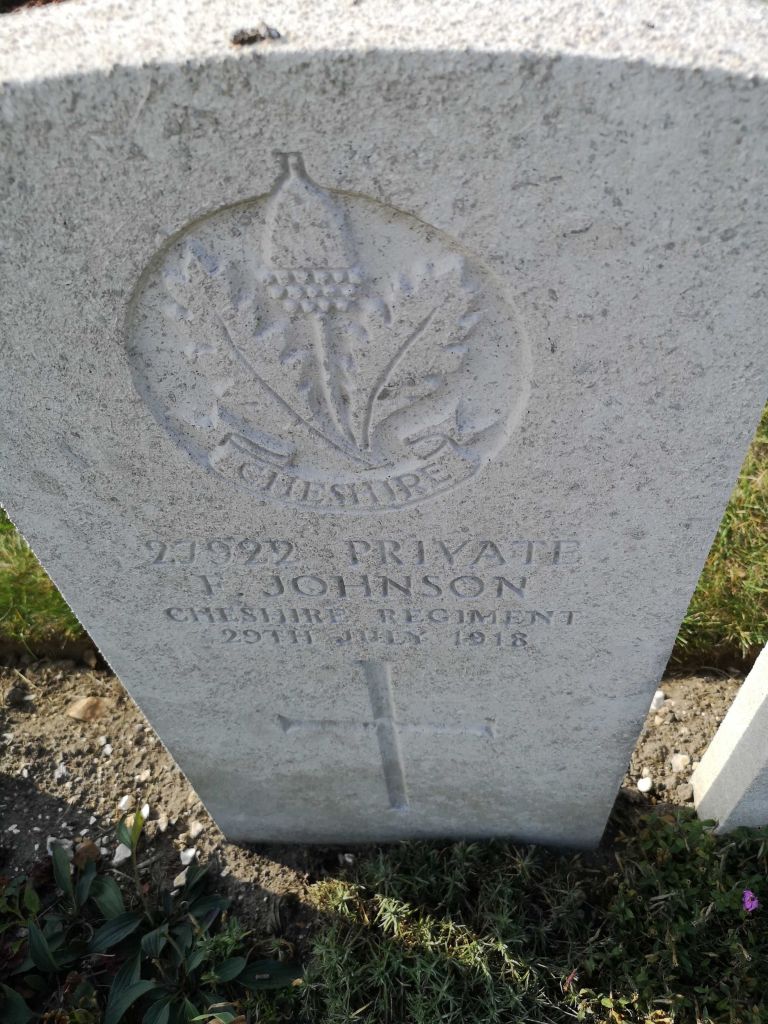 29/07/1918 Private Frank Johnson 1st/4th Bn. St. Sever Cemetery Extension, Rouen, Seine-Maritime France. ‘27922’ (pic from findagrave.com – with thanks)