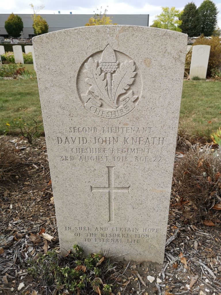 3/08/1918 Second Lieutenant David John Kneath (Age 22) 5th Bn. St. Sever Cemetery, Rouen, Seine-Maritime France. ” Son of Robert and Maria Kneath, of Penmaen, Glam. (pic from findagreave.com – with thanks)