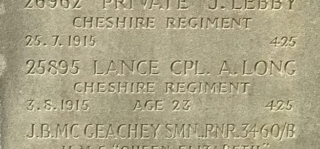 3/08/1915 Lance Corporal Alfred Long (Age 23) 3rd Bn. Birkenhead (Flaybrick Hill) Cemetery, Cheshire United Kingdom. ‘25895’ Son of Robert and Jane Long, of 16, Brook St., Crewe. (pic from findagrave.com – with thanks)