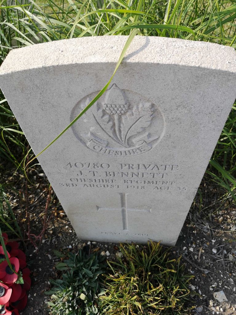 3/08/1918 Private John Thomas Bennett (Age 35) 1st/7th Bn. St. Sever Cemetery Extension, Rouen, Seine-Maritime France. ‘40780’ Husband of Ellen Bennett, of 10, Gladstone Rd., Seacombe, Wallasey, Cheshire. (pic from findagreave.com – with thanks)