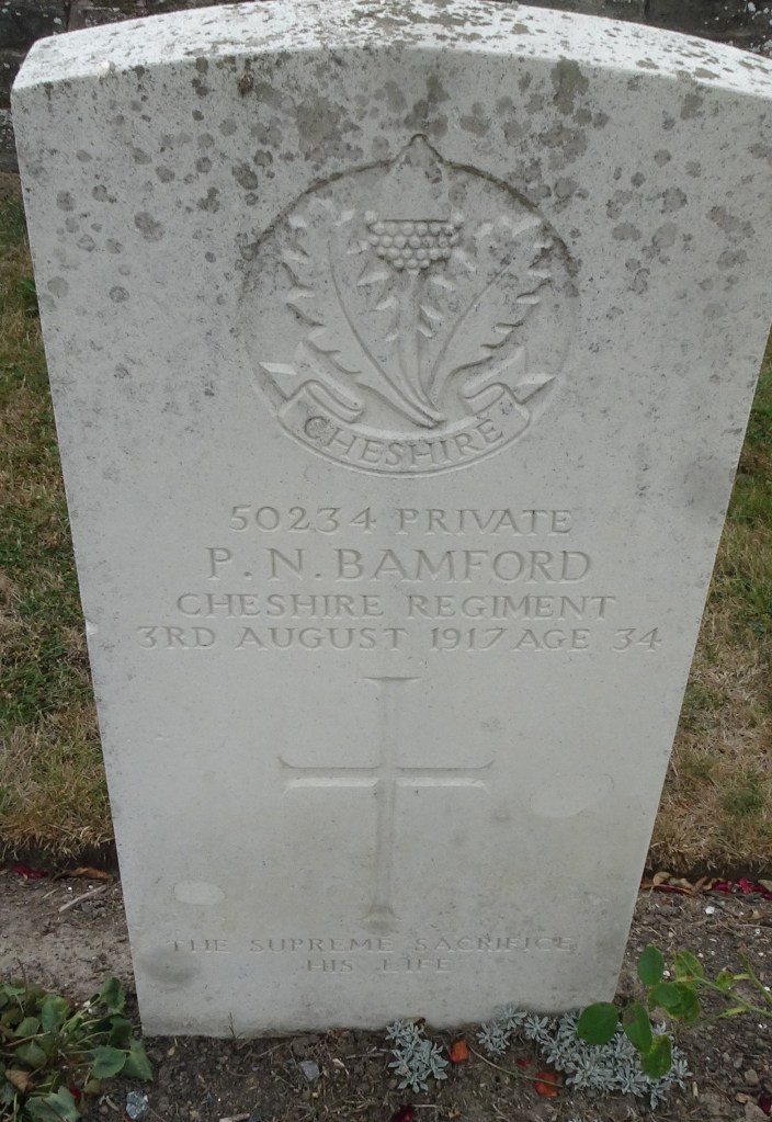 3/08/1917 Private Percy Newton Bamford (Age 34) 9th Bn. Oosttaverne Wood Cemetery, West-Vlaanderen Belgium. ‘50234’ Son of John William and Ann Bamford; husband of Annie Bamford, of 33, Chapel Rd., Northenden, Manchester.