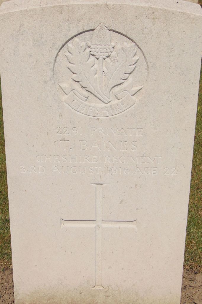 3/08/1916 Private Thomas Baines (Age 22) 1st/6th Bn. Brown’s Road Military Cemetery, Festubert, Pas de Calais France. ‘2291’ Son of Thomas and Mary Ann Baines, of 17, Heald St., Stockport. (pic from findagreave.com – with thanks)