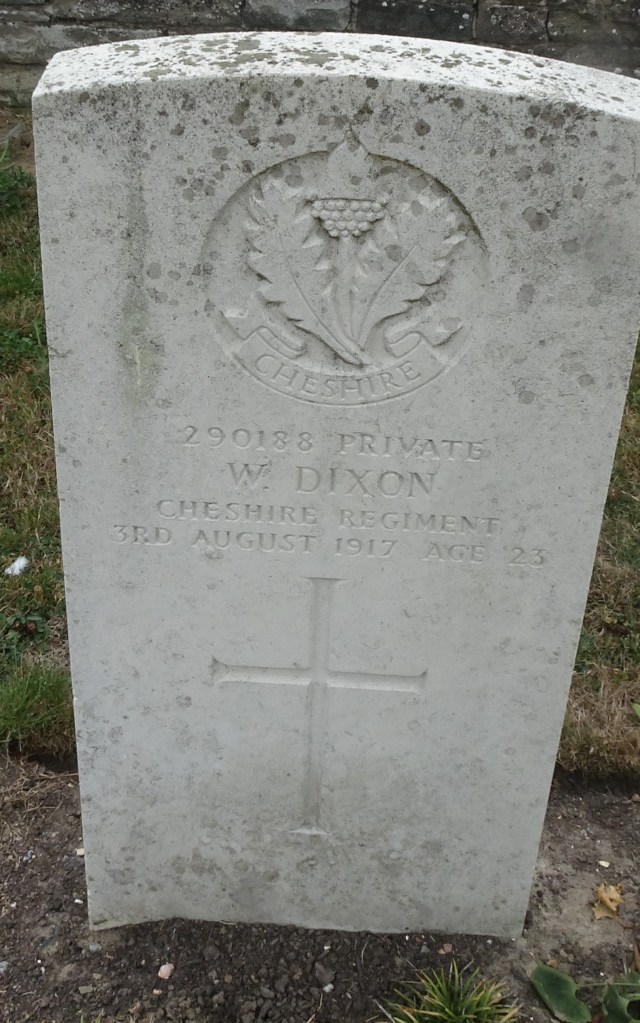 3/08/1917 Private William Dixon (Age 23) 9th Bn. Oosttaverne Wood Cemetery, West-Vlaanderen Belgium. ‘290188’ Son of John and Alice Dixon, of 646, Liverpool Rd., Platt Bridge, Wigan. Born at Wheelock, Sandbach, Cheshire.