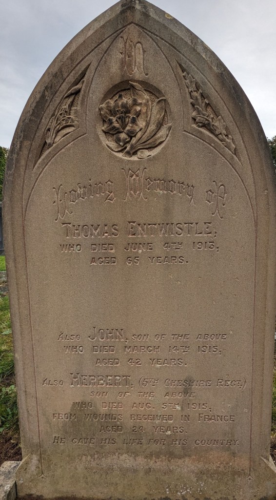 5/08/1915 Drummer Herbert Entwistle (Age 24) 5th Reserve Bn. Hale Cemetery, Cheshire United Kingdom. ‘1126’ Son of Thomas and Elizabeth Entwistle, of Altrincham. (pic from findagrave.com – with thanks)