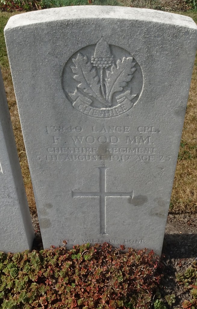 5/08/1917 Lance Corporal Frederick Wood (Age 25) MM “B” Coy. 10th Bn. Mendinghem Military Cemetery, West-Vlaanderen Belgium. ‘13849’ Son of James and Mary Wood, of Lostock Gralam, Cheshire.