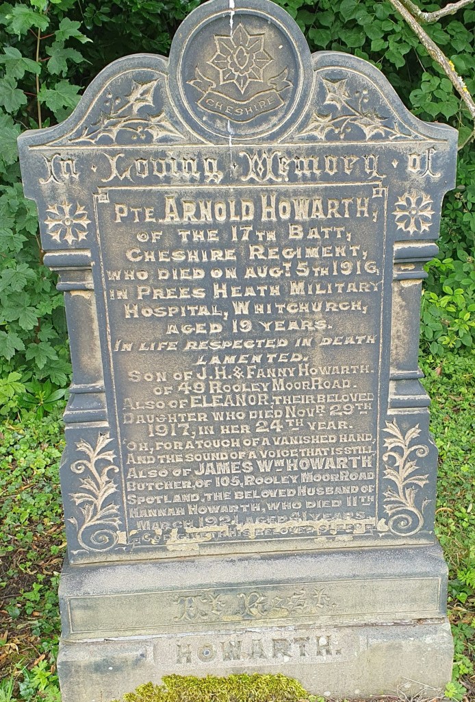 5/08/1916 Private Arnold Howarth 17th Bn. Rochdale Cemetery, Lancashire United Kingdom. ‘46955’ (pic from findagrave.com – with thanks)