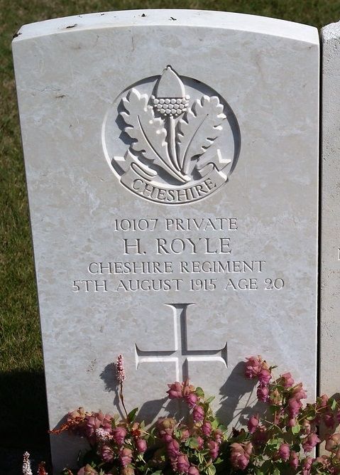 5/08/1915 Private Harry Royle (Age 20) 2nd Bn. Le Treport Military Cemetery, Seine-Maritime France. ‘10107’ (pic from findagrave.com – with thanks)