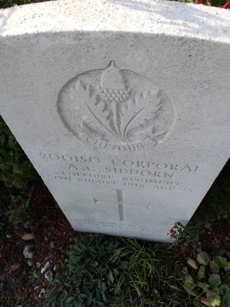 7/08/1918 Corporal Albert Goulding Siddorn (Age 25) 1st/4th Bn. St. Sever Cemetery Extension, Rouen, Seine-Maritime France. ‘200150’ Son of Samuel and Elizabeth Siddorn, of 28, Queen Mary’s Drive, Port Sunlight, Cheshire. Native of Winsford, Cheshire. (pic from findagrave.com – with thanks)