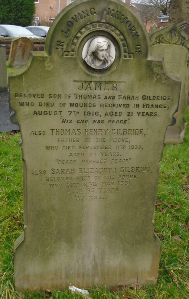 7/08/1916 Private James Gilbride (Age 21) 9th Bn. Ellesmere Port (Christ Church) Churchyard, Cheshire United Kingdom. ‘12494’ Son of Thomas Henry and Sarah Elizabeth Gilbride, of 21, Merseyton Rd., Ellesmere Port. (pic from findagrave.com – with thanks)