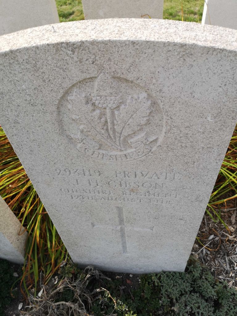 12/08/1918 Private Joseph Harold Gibson 1st/7th Bn. St. Sever Cemetery Extension, Rouen, Seine-Maritime France. ‘293119’ (pic from findagrave.com. – with thanks)