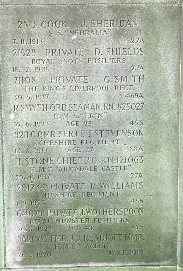 13/08/1917 Company Quartermaster Serjeant Thomas Stevenson (Age 27) 3rd Bn. Birkenhead (Flaybrick Hill) Cemetery, Cheshire United Kingdom. ‘9211’ (pic from findagrave.com. – with thanks)