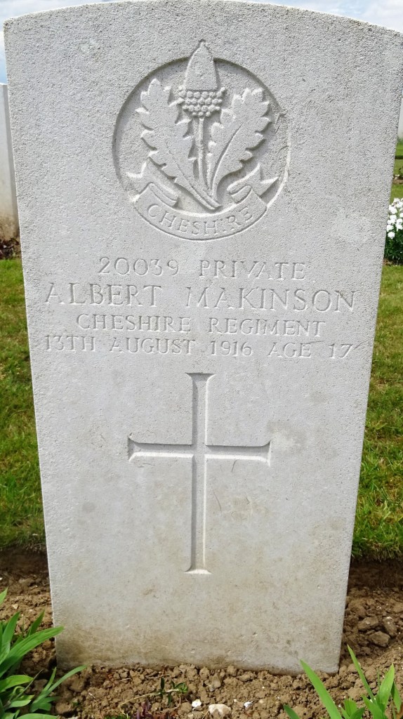 13/08/1916 Private Albert Makinson (Age 18) 15th Bn. Dive Copse British Cemetery, Sailly-Le-Sec, Somme France. ‘20039’ Son of John and Mary Ann Makinson, of 15, Portland St., Warrington. (pic from findagrave.com. – with thanks)