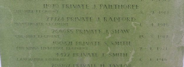 13/08/1917 Private William Clarke (Age 30) 11th Bn. Ypres (Menin Gate) Memorial, West-Vlaanderen Belgium. ‘31033’ Son of William and Mary Clarke, of 3, Dale St., Warrington; husband of Hannah Clarke, of 120, Pierpoint St., Warrington.
