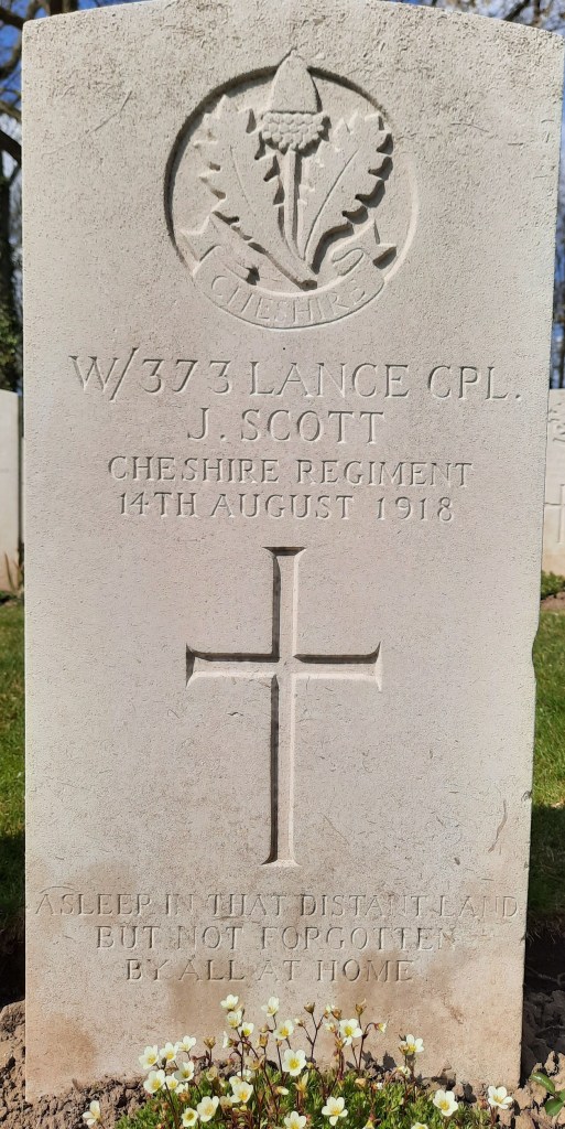 14/08/1918 Lance Corporal John Scott (Age 28) 9th Bn. Sandpits British Cemetery, Fouquereuil, Pas de Calais France. ‘W/373’ Son of George and Mary Scott, of Greasby, nr. Birkenhead. (pic from findagrave.com – with thanks)