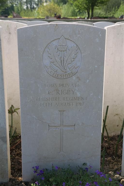 14/08/1917 Private Charles Rigby 9th Bn. Bailleul Communal Cemetery Extension, Nord, Nord France. ‘50185’ (pic from findagrave.com – with thanks)