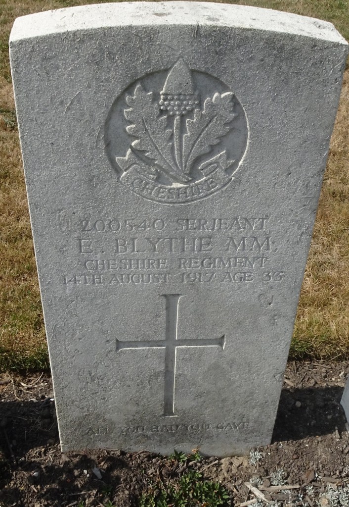 14/08/1917 Serjeant Enoch Blythe (Age 33) MM 13th Bn. Mendinghem Military Cemetery, West-Vlaanderen Belgium. ‘200540’ Husband of Martha Jane Blythe, of 87, Powell St., Birkenhead.