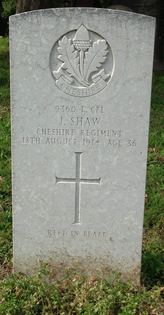 18/08/1914 Lance Corporal James Shaw (Age 36) 3rd Special Reserve Bn. Hoylake (Holy Trinity) Churchyard, Cheshire United Kingdom. ‘9360’ Son of the late James Shaw; husband of Georgina Margaret Shaw, of 141, Church St., Ashton-under-Lyne. Born at Dukinfield, Cheshire. (pic from findagrave.com. – with thanks)