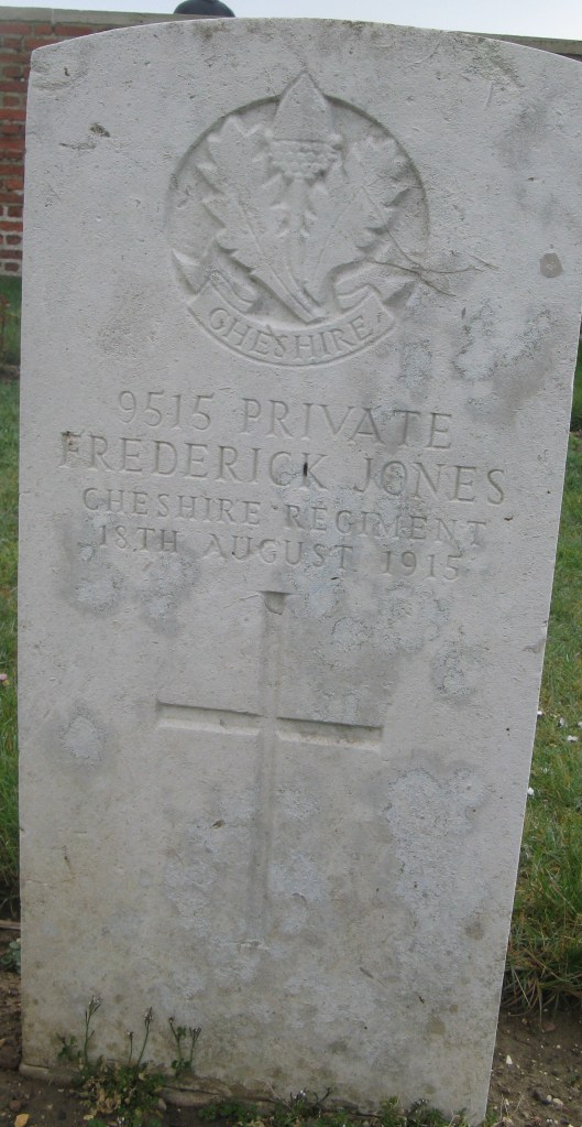 18/08/1915 Private Frederick Jones (Age 20) 1st Bn. Point 110 Old Military Cemetery, Fricourt, Somme France. ‘9515’ Son of Thomas Frederick and Susan Elizabeth Jones, of 24, Barker St., Nantwich. (pic from findagrave.com. – with thanks)