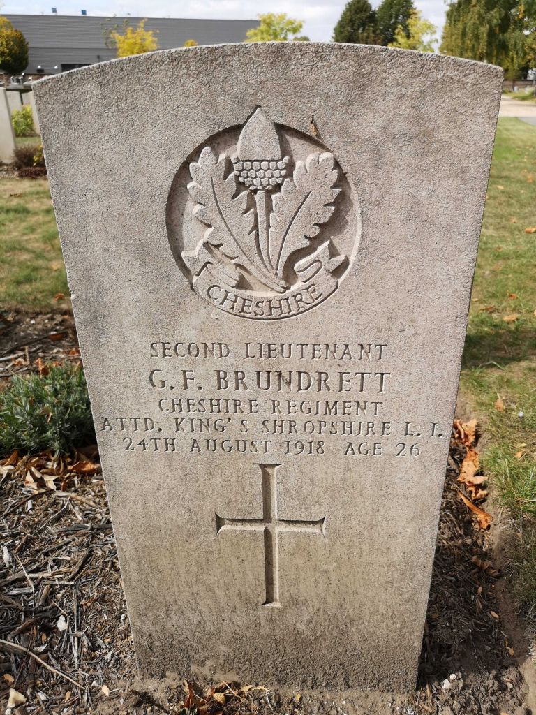 24/08/1918 Second Lieutenant George Frederick Brundrett (Age 26) 5th Bn. St. Sever Cemetery, Rouen, Seine-Maritime France. ” Son of George Grantham Brundrett and Elizabeth Ann Brundrett, of 16, Leicester Rd., Newport, Mon.(Shropshire Yeomanry) (pic from findagrave.com. – with thanks)