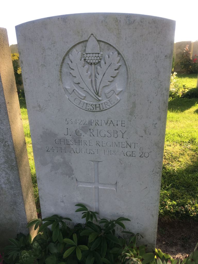24/08/1918 Private Joshua George Rigsby (Age 20) 1st/6th Bn. Arneke British Cemetery, Nord France. ‘53422’ Son of Joshua and Hester Rigsby, of 9, Wernddu Cottages, Caerphilly, Cardiff.(Shropshire Yeomanry) (pic from findagrave.com. – with thanks)